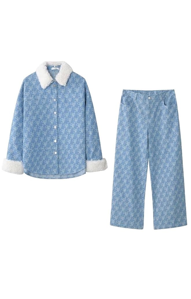 YUSHE Women 2-Piece Embroidered Shirt & Pant Set with Detachable Faux Fur Zipper Front Comfort Wear