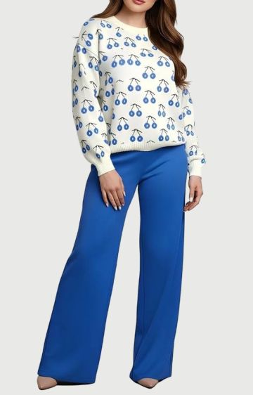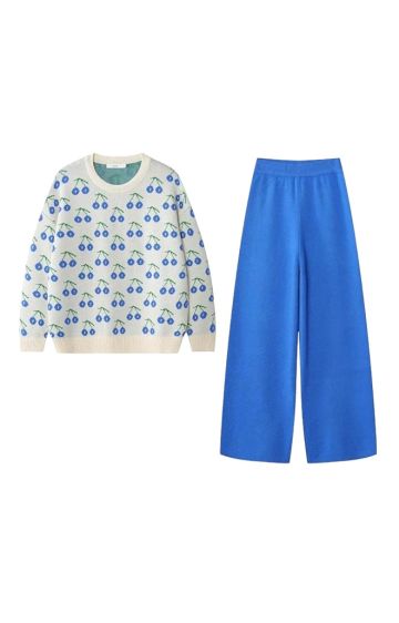 YUSHE Women 2-Piece Lounge Set Cherry Motif Pullover with High Rise Pants Relaxed Everyday Wear