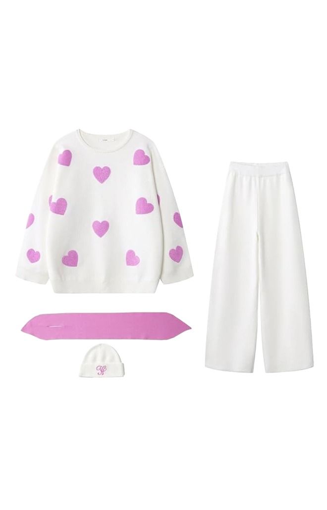 3D Heart Knit Pattern & Functional Design - Heart motifs are knitted directly into the fabric for subtle 3D texture and visual depth. The crew neck sweater and high-rise elastic waist pants provide comfort, flexibility, and Valentine’s-ready wear.