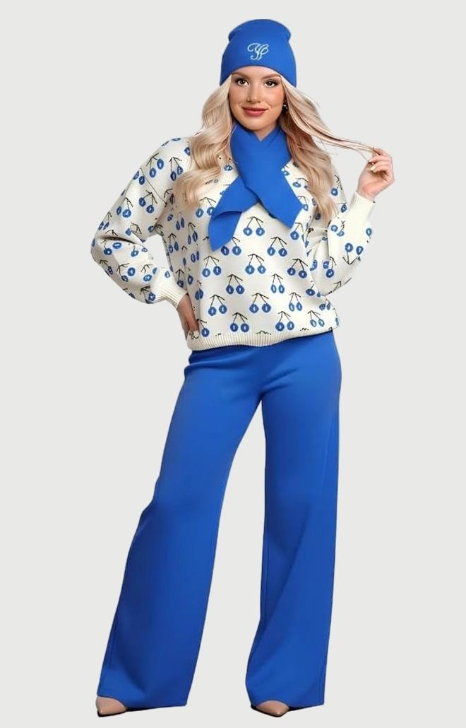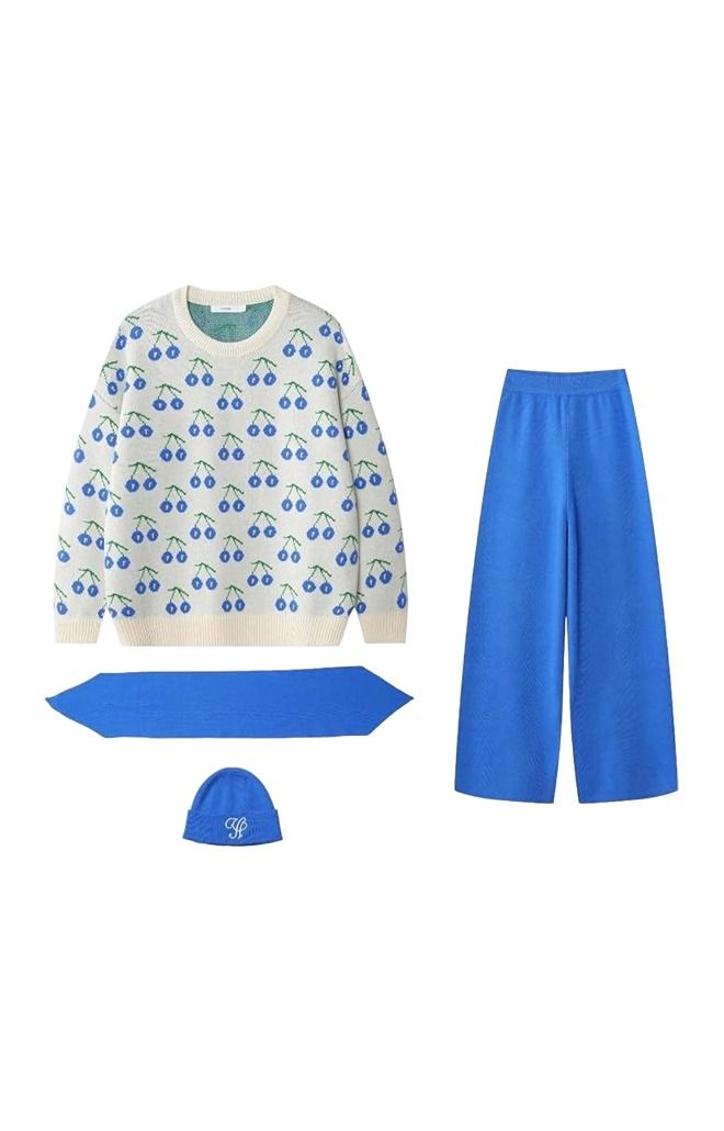 Designed for moments when comfort meets intention, this YUSHE women’s 4-piece lounge set delivers a refined take on coordinated winter dressing. Thoughtful details, soft structure, and elevated craftsmanship come together in one effortless ensemble. The set features a long-sleeve pullover sweater adorned with adorable cherry motifs intricately knitted directly into the yarn, paired with high-rise wide-leg pants finished with a flexible elastic waistband. Completing the look are a matching neck warmer and coordinating cap, designed to align seamlessly with the set’s overall palette for a cohesive finish. Crafted from a premium blend materials, the fabric offers a smooth hand feel, breathable warmth, and lasting shape. The cherry motifs are integrated into the fabric itself rather than applied on the surface, creating a clean, high-quality finish with depth and texture. A soft off-white base allows the motifs to stand out while keeping the overall look balanced and wearable. Designed for real-life winter routines, this set transitions easily from relaxed days at home to travel, casual outings, or cozy social plans. The relaxed fit allows natural movement without feeling oversized, while the high-rise pants provide comfort that lasts throughout the day. The included accessories complete the outfit without additional styling effort. The cap features a subtle embroidered YUSHE logo, adding a branded touch, while the neck warmer enhances warmth and visual continuity. Created by a women-led brand where 80% of the team is women, this set reflects real understanding of comfort, proportion, and everyday confidence. A complete winter look, thoughtfully coordinated and easy to wear. Add this YUSHE set to your wardrobe and elevate everyday comfort with refined design.